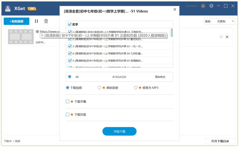 步骤3: 当完成解析后,软件会弹出选择对话框,此时选中想要下载的项并点击 开始下载 按钮